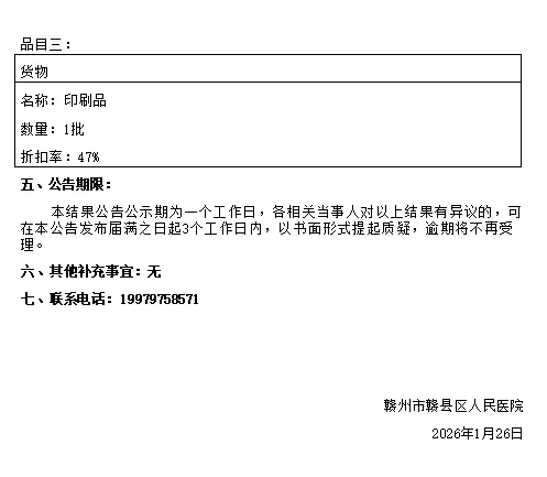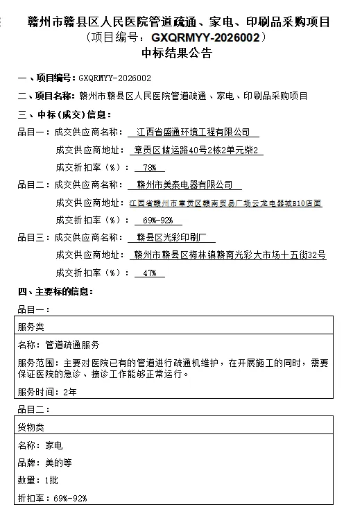 >公示公告|赣州市赣县区人民医院管道疏通、家电、印刷品采购项目中标结果公告