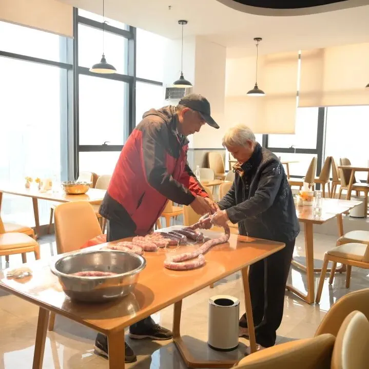 最受期待的香肠制作环节将活动推向高潮。工作人员已把新鲜前腿肉绞成肉馅,搭配白酒、盐、味精等调料,客户们根据口味调整咸淡后分工协作:装肉馅、推肠衣、扎棉绳、修边角,动作虽生疏却满脸认真。一位阿姨一边打结一边分享儿时过年灌香肠的回忆,现场肉香与调料香交织,满是烟火气。工作人员穿梭其间提供指导,确保每位客户都能做出满意的香肠,大家纷纷拿起成果拍照留念。