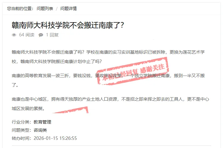 近日,有网友在“问政赣州”平台上咨询:赣南师大科技学院是否会搬迁至南康。