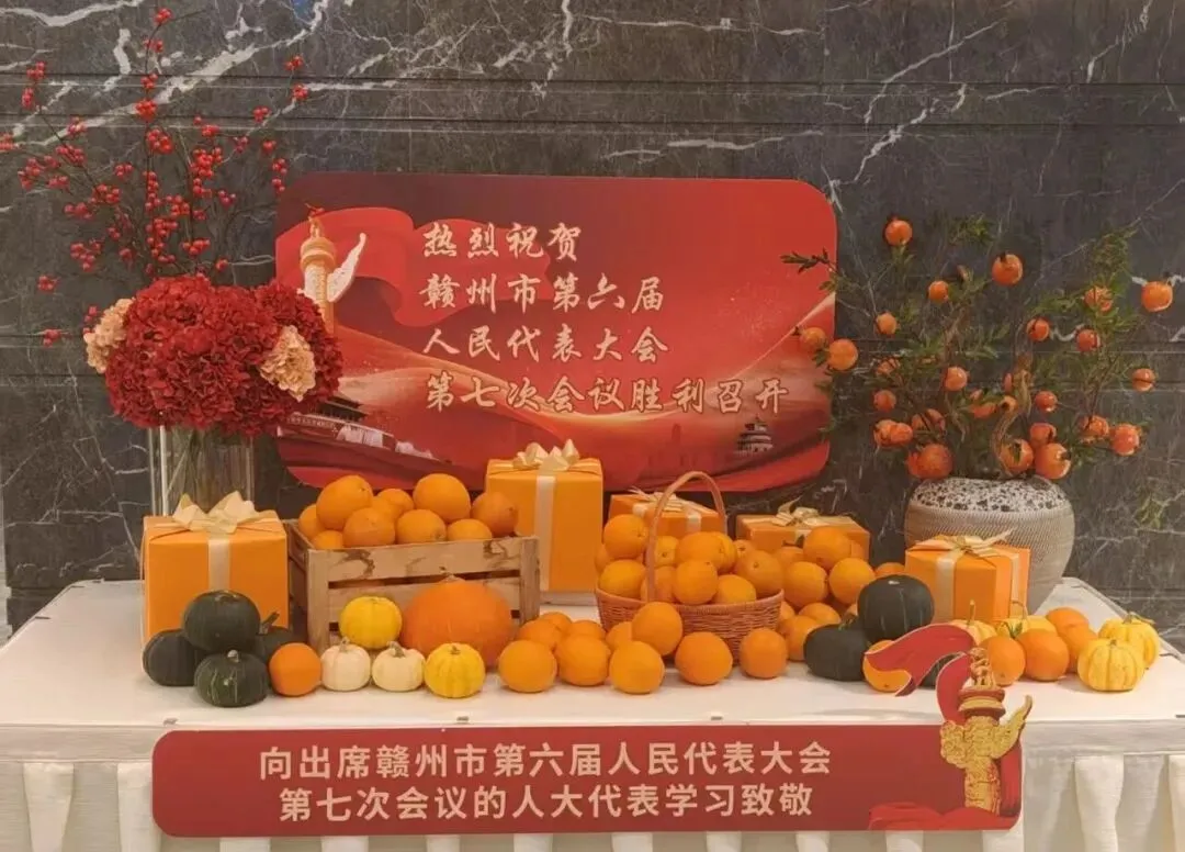 在宾馆环境营造上,融入特色文化元素,脐橙果篮错落有致,橙香盈盈,以温馨标语装饰营造庄重、热烈的会议氛围。