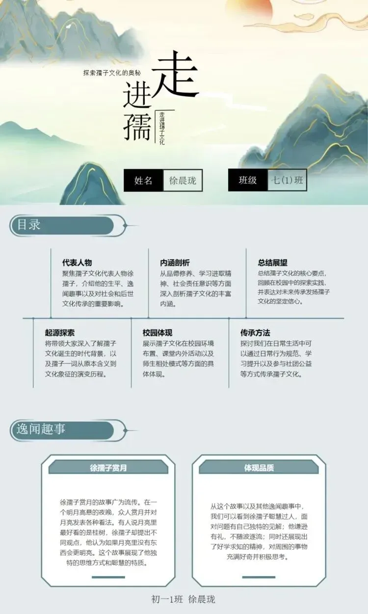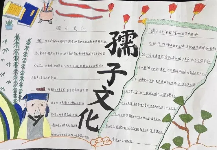 同学们踏访孺子故地,网罗典籍珍闻,访谈乡邻旧忆,于实地考察中触摸历史温度;再以PPT、手抄报、调研报告等多元形式,将所见所感、所思所悟凝练成鲜活作品,让孺子精神可观可感、可学可传。