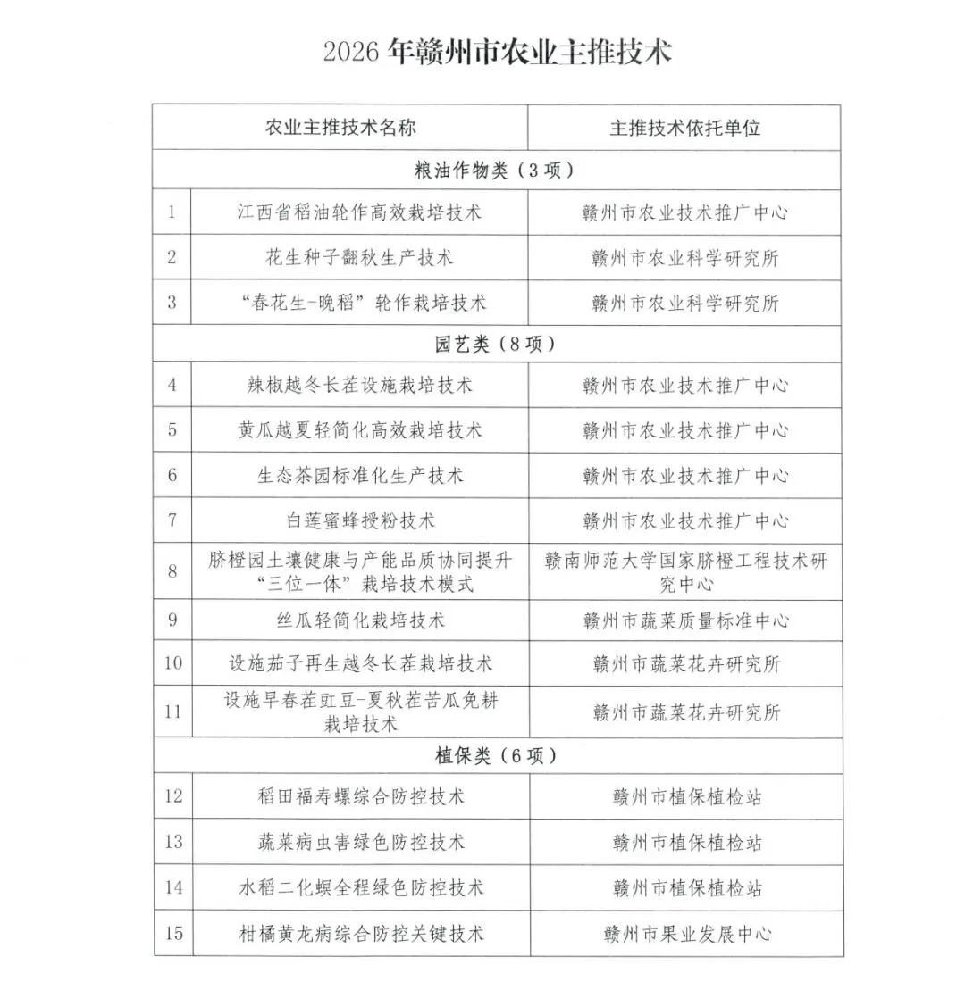 为持续强化农业科技支撑,推动农业科技成果快速转化和集成应用,发挥科技对粮食等重要农产品稳产保供的支撑作用。结合我市实际,市农业农村局组织遴选了2026年农业主推技术32项,现予推介发布。
