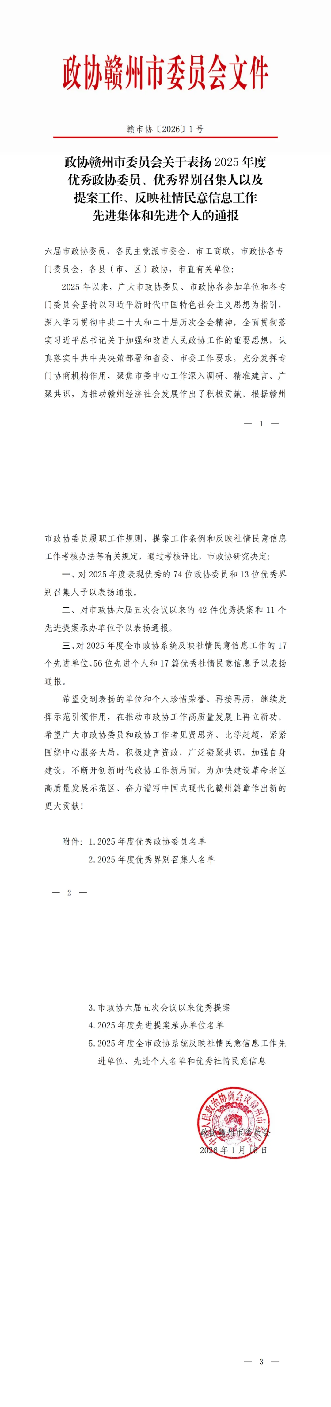 1月22日下午,赣州市政协六届六次会议闭幕,会上通报表彰了2025年度优秀政协委员、优秀界别召集人以及提案工作、反映社情民意信息工作先进集体和先进个人,民进赣州市委会2件提案和10名会员获表彰!