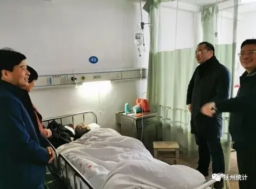 1月14日,抚州市统计局党组书记黄德明、副局长黄福荣、四级调研员周光艳等同志一行5人赴抚州市人民医院,看望慰问住院干部于文燕同志。 于文燕同志于周一上班途中,不幸遭遇交通事故,被送往市人民医院治疗。尽管其生病在床,但仍然惦记调查单位月度审批工作,认真向前来看望的同事交代了相关工作事宜。 局领导在病床前详细询问了于文燕的伤情和诊治情况,充分肯定和赞扬了她认真负责的工作态度和忘我的敬业精神,并送上工会慰问金,祝她早日康复。