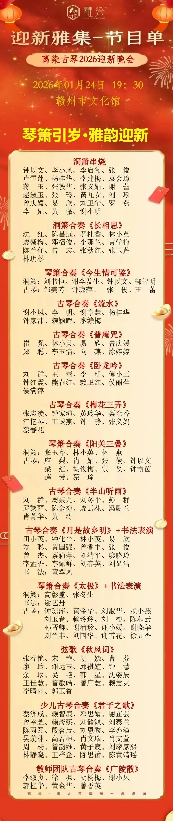乙巳辞尘,丙午启序;丝弦逐韵,跃马迎春。章贡河畔,雅集一堂;琴箫和鸣,共赴春约。赣州离染琴社于2026年1月24日,在赣州市文化馆音乐厅举行了琴箫引岁·雅韵迎新的新春晚会,雅集现场贤达齐聚,清辉满台,以千年国乐为引,赴一场跨越古今的风雅之约。