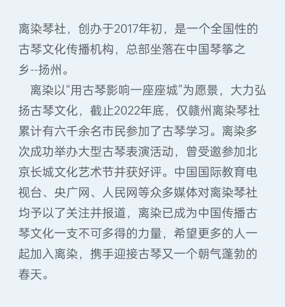 愿年会的琴音常驻心间,化作往后岁月的温柔力量;愿离染琴社在新的一年里,弦歌不辍,集结更多知音挚友,共赴风雅之约!