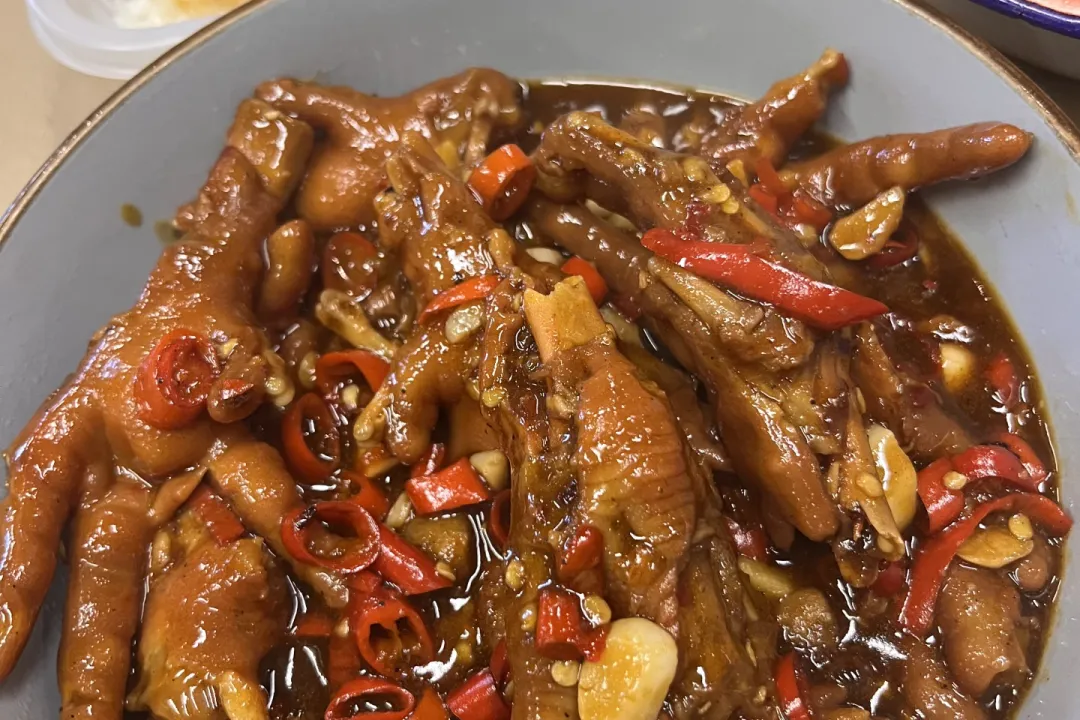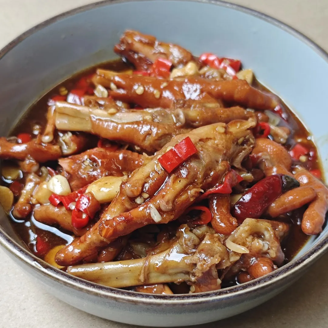 鸡脚炖煮得软烂适口,皮肉紧实又不失弹性,骨香混着酱香。甜中带辣的滋味很是下饭,色泽油润诱人,咸淡刚好,吃起来毫无腥气,越嚼越香。