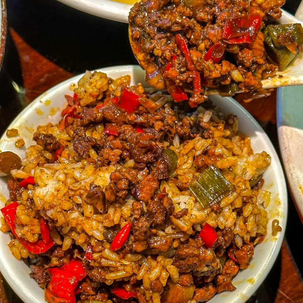 鸭肉剁得细碎,肉质紧实不柴,咬开还能尝到肉汁。鸭血滑嫩,和鸭肉、酱汁交融,汤底浓稠挂味,拌在米饭里刚好裹住米粒,咸香微辣的滋味顺着米饭散开。