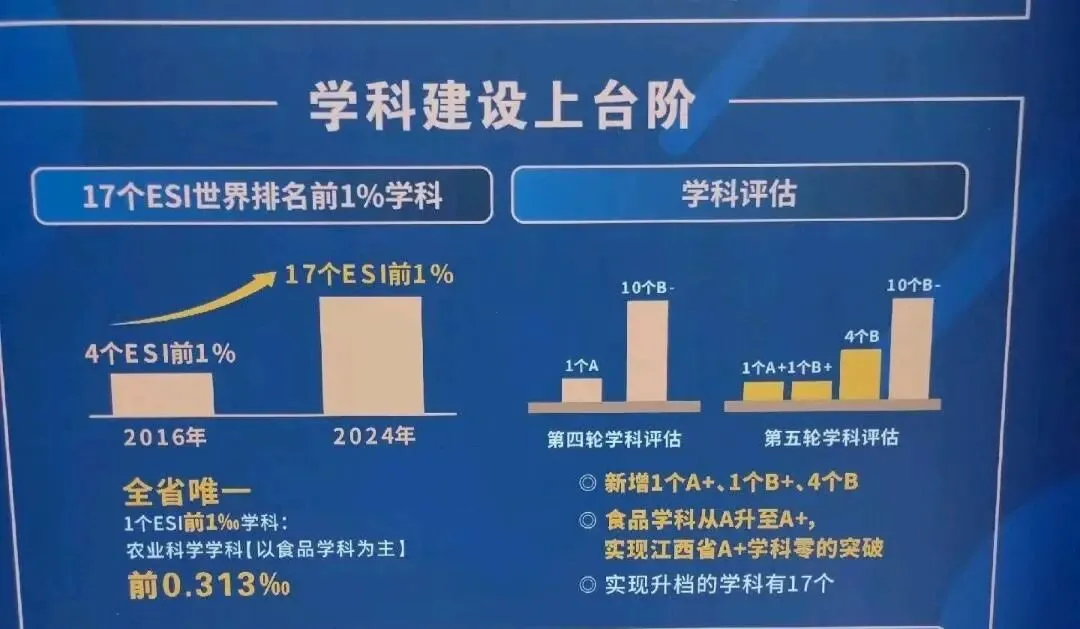 ● 南昌大学线下学科建设宣传展板,透露本校第五轮学科评估中,B 类学科对比上轮新增 1 B+ / 4 B,食品科学与工程由上轮 A 登顶至 A+,实现江西省 A+ 学科零的突破。