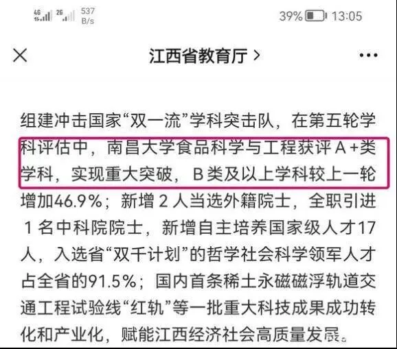 ▲ 江西省教育厅证实南昌大学食品科学与工程登顶 A+