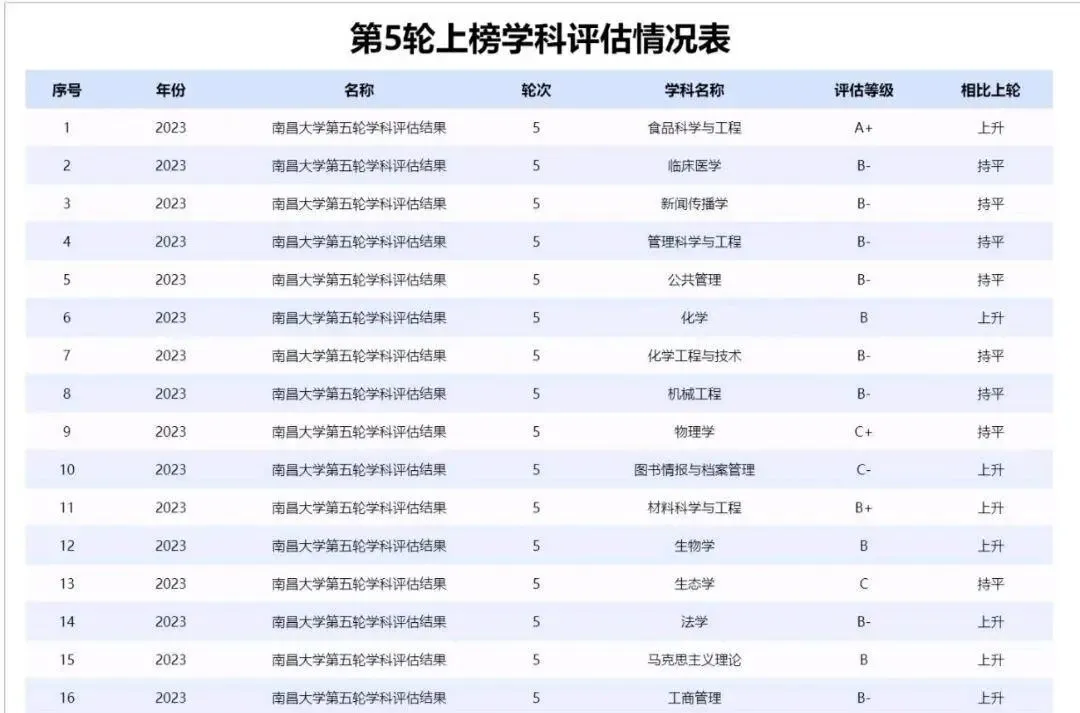 南昌大学线上 / 线下低调官宣第五轮学科评估结果,全校共斩获一枚宝贵的 A+ 学科,另有 1 B+ / 4 B / 10 B- 共计十五个 B 大类学科。