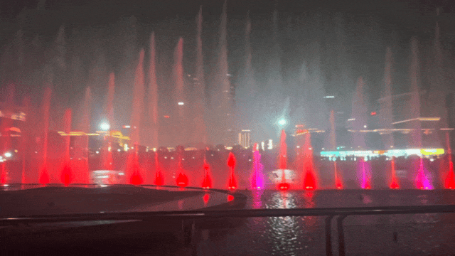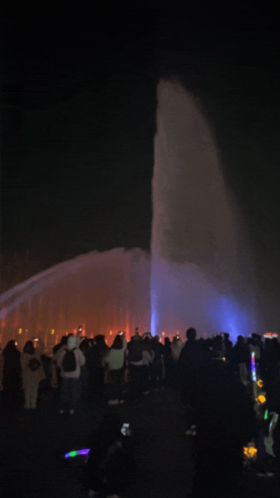 中途的喷泉表演有点过于平淡,当你以为结束准备走的时候,广播开始预告:Ending pose!最后一个大水柱较为壮观,一定会淋湿台阶前侧的观众,所以要记得避开这个观赏位置。