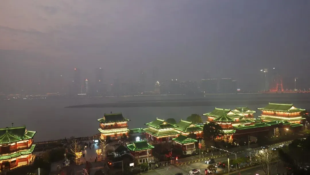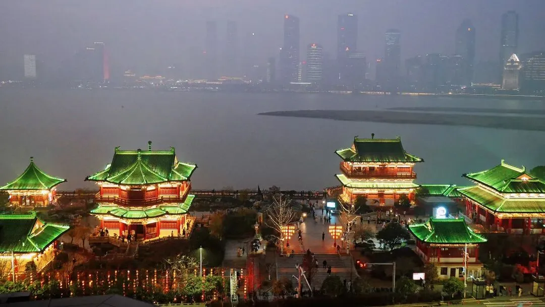 北园其实修的也挺美,在酒店楼上就能看到整个建筑群,右侧还能瞧见红色的八一大桥,就是雾霾太浓,能见度不高。景区夜间亮灯,很多穿汉服的小姐姐在这里取景拍照。