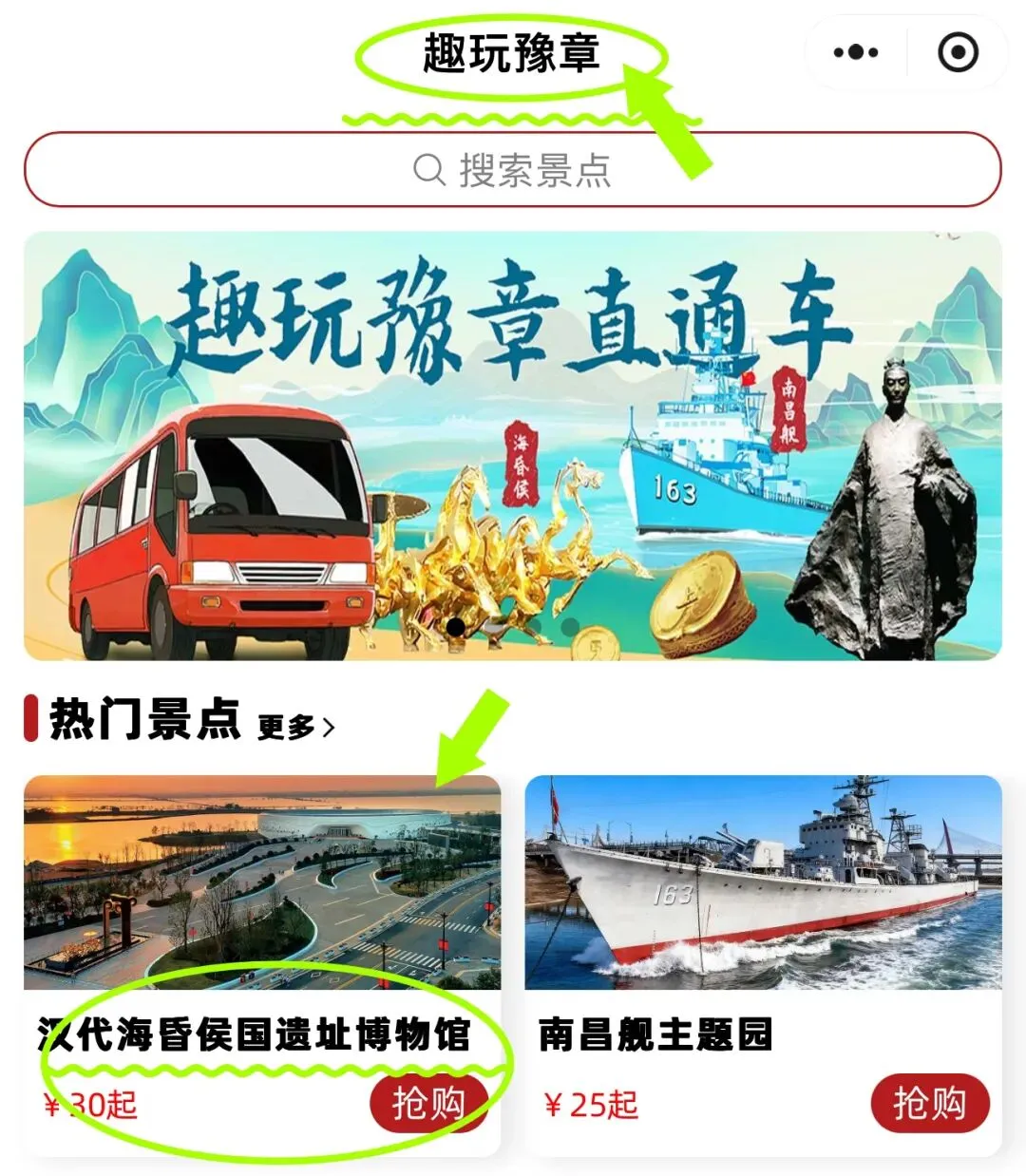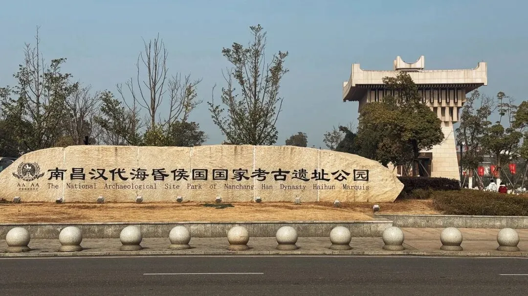 海昏侯国遗址博物馆距离市区40多公里,坐公共交通相当折腾。小某书有人指路——微信小程序“趣玩豫章”上面可以订到往返景区的直通车,我们选择从“滕王阁南1门”(往返)。走到南1门附近,有个小门亭外面竖立着“发车点”的牌子,出示购票凭证兑换手环,坐上对面停着一辆旅游小巴到点出发。旅游小巴有点闷热拥挤,晕车人士不建议选择这个交通方式前往。
