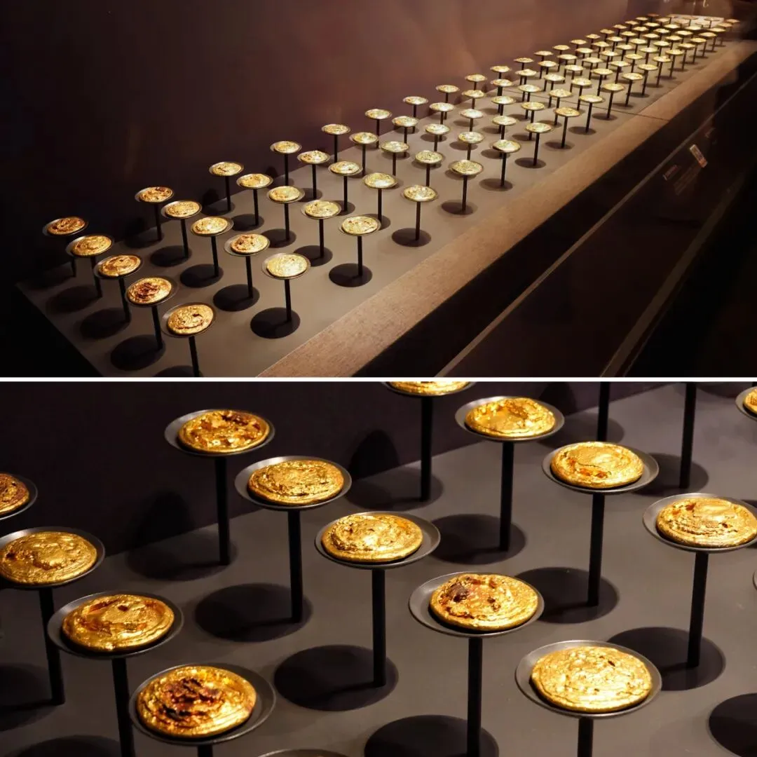 整个博物馆最吸睛的当然是“金色海昏”展厅!刘贺墓出土了250g的金饼385件,其中100件垫在刘贺遗骸身下的包金琉璃席下,还有很多马蹄金、麟趾金、钣金……金光闪闪,富贵迷人,忍不住开始幻想,按现在的金价,有几块金饼就能彻底躺平。