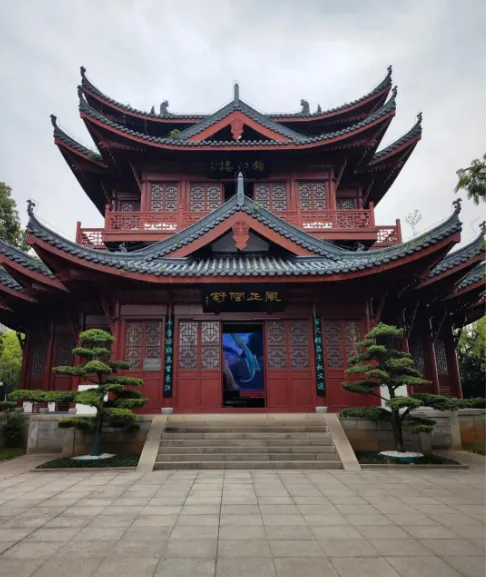 “浔阳江头夜送客,枫叶荻花秋瑟瑟。”琵琶亭以白居易的名曲《琵琶行》命名,相传是当时他听了歌女的弹唱后所作的诗句而修建的。沉浸在一片生动的投影里,小船漂过水面,枫叶轻轻飘落,诗人和琵琶女仿佛穿越了时空,那悠悠的琵琶声混着江边波浪声,把人带进那个诗意瞬间。