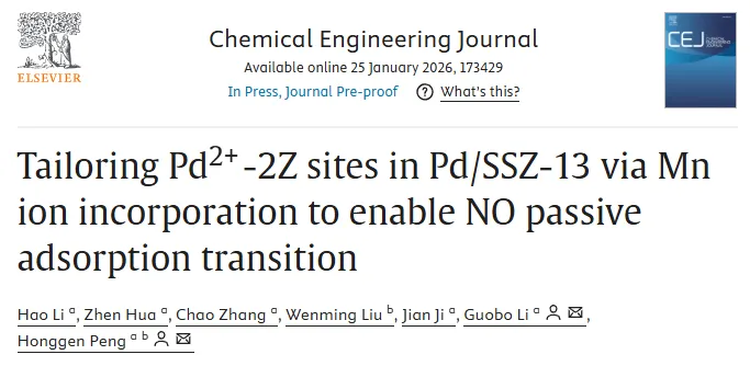 随着柴油车排放法规日益严格,低温工况下的氮氧化物(NOx)控制成为尾气后处理系统的关键挑战。柴油发动机在冷启动阶段,排气温度较低,传统的选择性催化还原(SCR)系统因温度不足而无法有效工作,导致大量NOx直接排放。被动NOx吸附器(PNA)技术应运而生,通过在低温下吸附NOx并在温度升高后释放,实现与SCR系统的有效衔接。Pd/SSZ-13分子筛因其优异的低温NOx吸附性能,被视为最具潜力的PNA材料之一。然而,该催化剂存在活性位点吸附强度不均匀的问题。具体而言,PdOx团簇在低于200°C的温度下就会发生NOx过早脱附,而Pd²⁺离子交换位点的脱附温度较高。这种脱附温度的差异导致NOx释放与SCR系统工作窗口不匹配,影响整体脱硝效率。因此,如何通过活性位点工程调控Pd物种分布,提高低温吸附位点的热稳定性,实现NOx脱附温度与SCR操作窗口的精准匹配,成为当前环境催化领域亟待解决的关键科学问题。