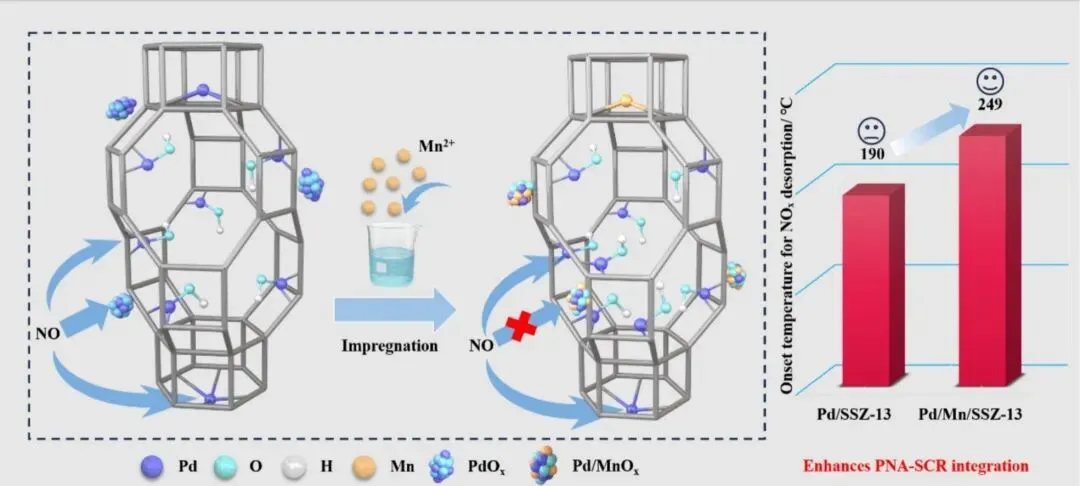 在这项研究中,研究人员开发了一种Mn²⁺介导的活性位点工程策略,通过共浸渍法将Mn²⁺引入Pd/SSZ-13催化剂体系。研究表明,Mn²⁺的引入发挥了双重调控作用:一方面,通过Pd-Mn电子相互作用,Mn²⁺有效抑制了PdOx团簇上的NOx吸附活性,避免了低温下的过早脱附;另一方面,Mn²⁺诱导Pd²⁺-2Z位点向羟基化的[Pd(OH)]⁺-Z物种转变,增强了NO的结合强度。通过XAFS分析和DFT计算,研究人员证实了Pd-Mn之间的电子调制效应;CO-DRIFTS和原位DRIFTS表征则验证了Pd物种的转变机制。优化后的Pd/Mn/SSZ-13催化剂表现出显著提升的热稳定性,NOx起始脱附温度从190°C提高至249°C,增幅达59°C。这一温度范围与商用SCR系统的工作窗口实现了良好匹配,为构建高效的PNA-SCR集成系统提供了材料基础。