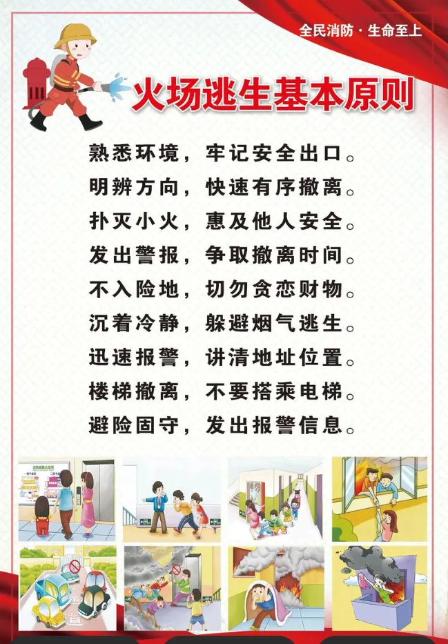 6.和孩子共学消防安全知识,教会孩子正确逃生技能:发现火情不擅自扑救,及时拨打119并清晰说明起火地点、火势、被困情况等关键信息,逃生时用湿毛巾捂口鼻,沿疏散通道弯腰低姿快速撤离。
