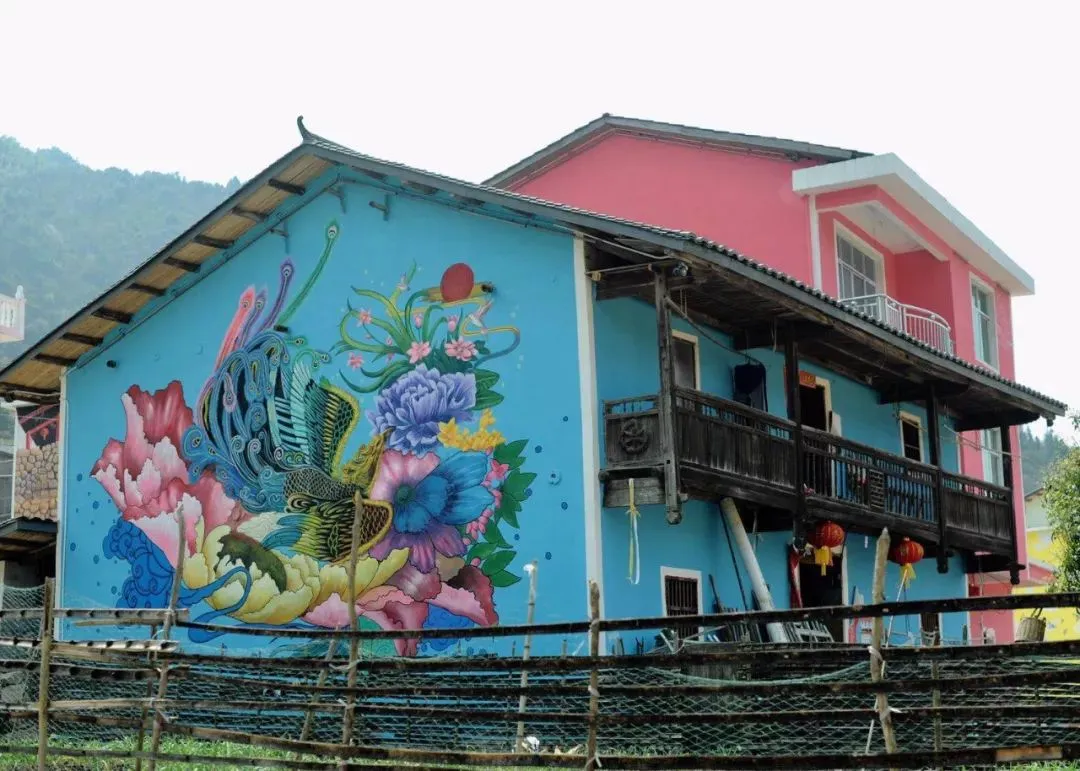 位于乐安县金竹畲族乡政府与金竹飞瀑景区之间,有一个深度贫困村——大通村。 村中墙体彩绘采用畲族文化元素,通过主题鲜明、创意新颖、图文并茂的标语、漫画、小故事等形式,勾勒出“美丽乡村”建设的蓝图,让这个曾经斑驳老旧的村庄,变成了“人在画中行”的自然与人文结合的彩绘新村。该村墙体彩绘特别绘制了3333只畲族图腾——凤凰,这也是目前集中绘制凤凰数量最多的一个村,堪称“中国第一彩绘村”。