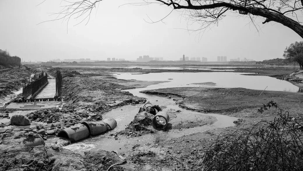 象湖水已放干,图片左下角是向象湖排污的管道,正在向象湖排放污水,图片左侧是正在修建的象湖排污箱涵。摄于2013年3月