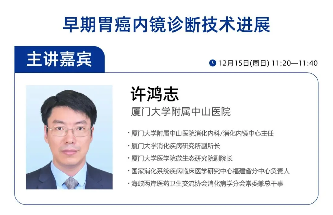 12月15日,厦门大学附属中山医院许鸿志教授将围绕《早期胃癌内镜诊断技术进展》进行专题分享,敬请期待。