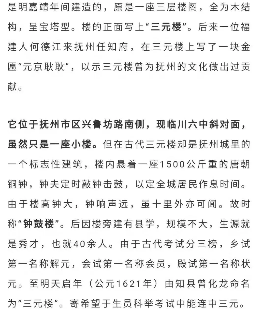 又因百年前的旧社会抚州城里经常闹土匪,土匪抓到以后,要被砍头,头颅就挂在钟鼓楼(三元楼)上示众,所以抚州民间流传一句俗语:我是找不到人,要不我去下钟鼓楼。这是一句骂人的土话,意即人死了。