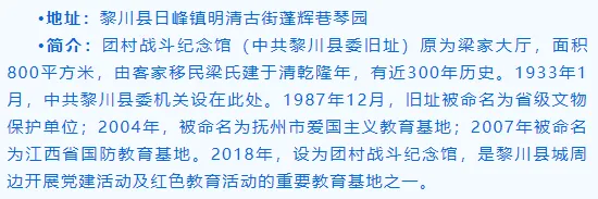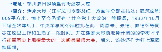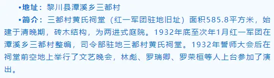 •简介:在第二次国内革命战争时期,陈坊村是中共崇仁县领导革命的中心,还一度成为扩大红色政权和许多革命领导人的重要指挥场所。1932年的4月7日,成立了东山村苏维埃政府;1933年4月11日,周恩来、朱德、王稼祥等领导率红一方面军总部转驻崇仁东山,在东山“山水清晖”设立指挥部。其所在地陈坊村被列为全国红色美丽村庄试点村,至今还保留着的革命遗迹、遗址主要有:红一军团指挥部(2018年列入省级文保单位)、红军医院旧址、中共崇仁县委员会、县苏维埃政府旧址,红军宿营地旧址、防空洞等。