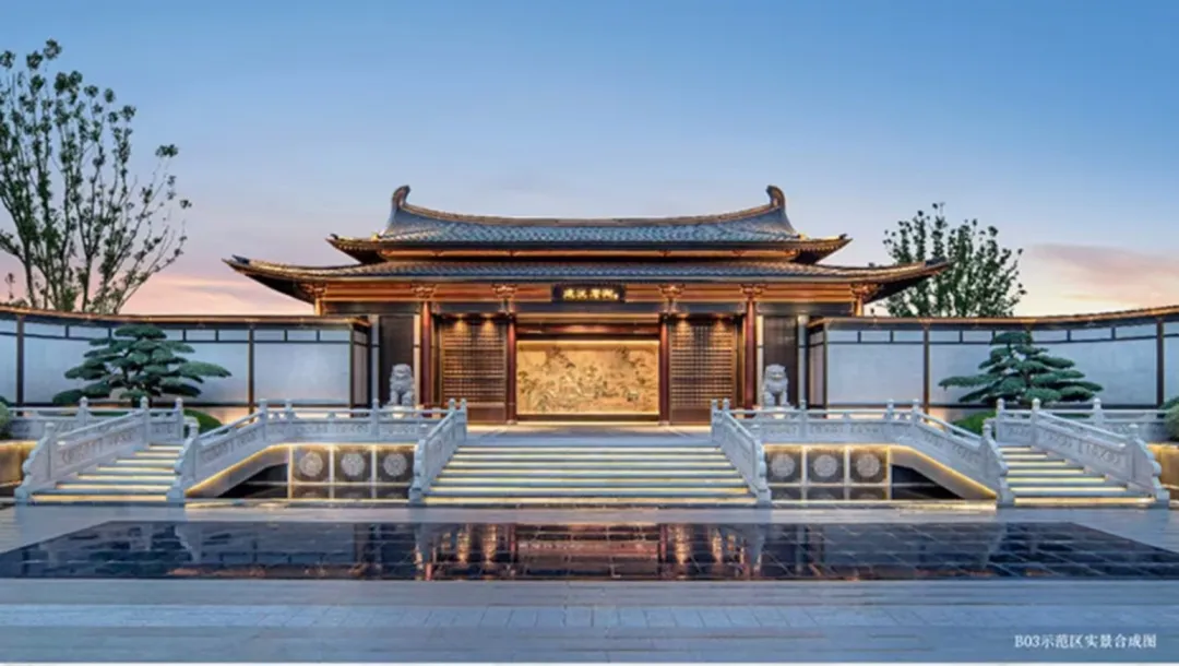 项目最吸睛的莫过于其独特的唐风建筑风格。约52米重檐歇山顶府门,五间三门规制,七级高阶拾级而上,双狮佑府,中庭约600㎡镜面水景……约4500平方米的盛唐实景示范区已盛大开放,让购房者能“所见即所得”。这不仅是对传统文化的致敬,更是一种稀缺的产品力表达。
