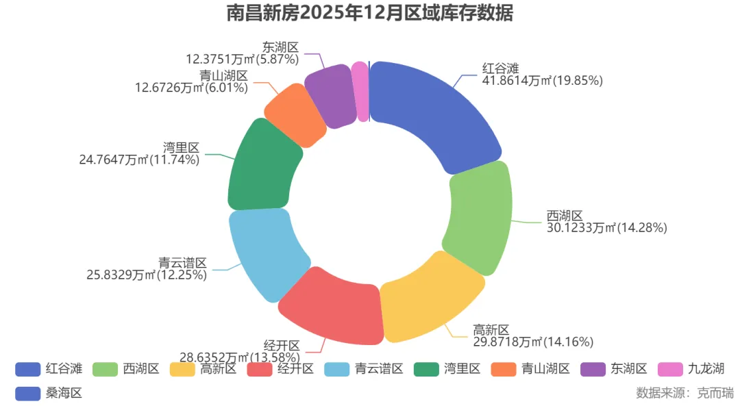 数据来源:克而瑞。根据克而瑞数据显示,2025年12月,整个红谷滩的新房库存面积为41.86万平方米,市场整体承压。