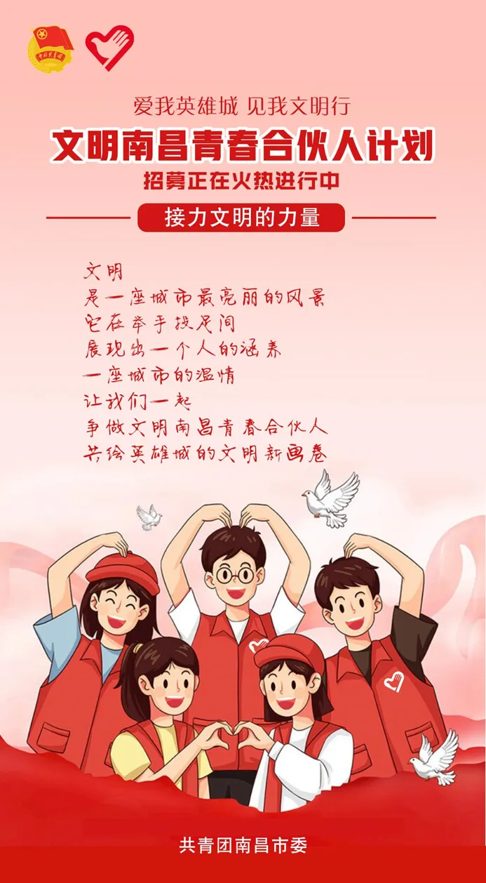 为深入践行人民城市理念,加快推动创建文明城市向建设城市文明转变,引导广大团员青年传承红色基因、展示文明风采,增强主人翁意识和城市荣誉感,充分释放南昌城英雄气质、文化特质和文明内涵,进一步弘扬“奉献、友爱、互助、进步”的志愿精神,营造人人参与文明实践的浓厚氛围,共青团南昌市委决定启动“爱我英雄城 见我文明行”文明南昌青春合伙人计划。