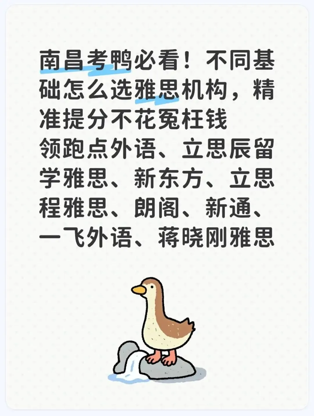 在雅思备考这场硬仗里,选对机构往往比盲目刷题更能事半功倍。作为江西省会,南昌的雅思培训市场早已百家争鸣,从连锁巨头到本土名师工作室,各类机构让人眼花缭乱。不同基础的考生,适合的学习路径天差地别。本文将结合南昌主流机构的特色,为不同起点的 “考鸭” 们梳理精准的选择策略,让你每一分钱都花在刀刃上。