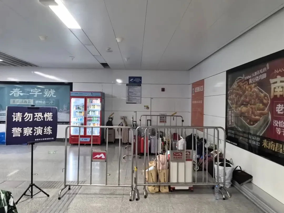 吃过饭坐地铁2号线到八一广场3号口出,地铁出口里竟然有专门的大件行李区,有警察和监控帮打卡的游客看行李。