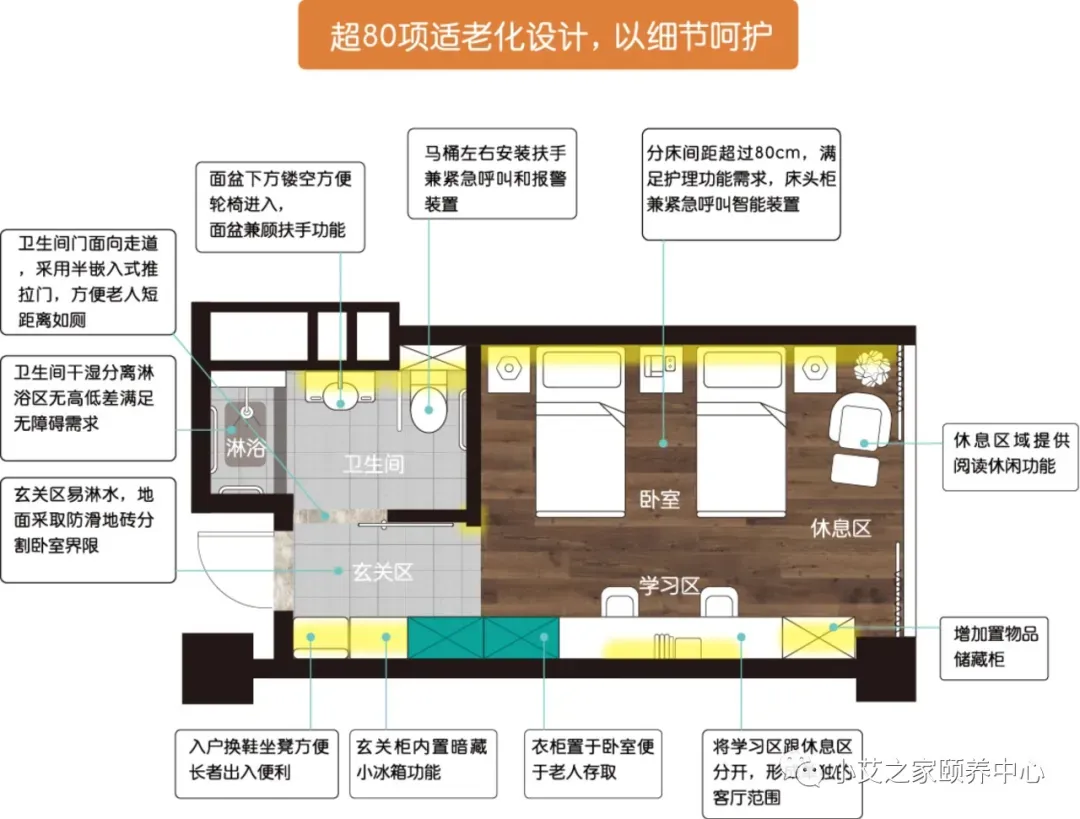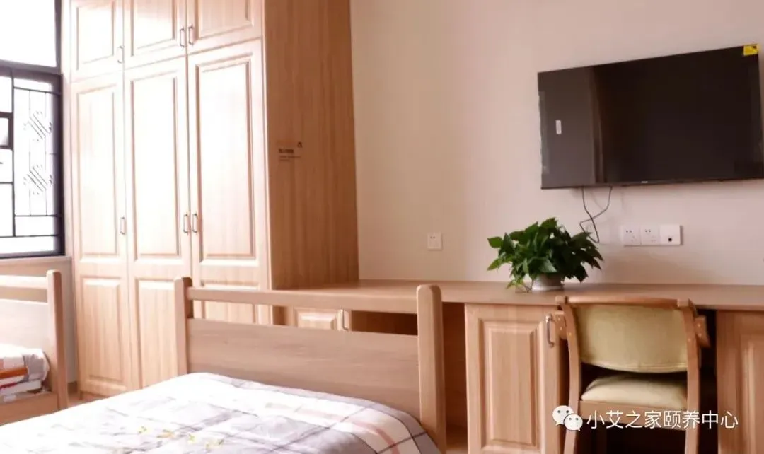 房间配备多个紧急呼叫按钮、独立卫生间,家具家电齐全。所有家具均采用长者偏爱的原木材料,并切割成圆弧造型,既安全又舒适。室内整体氛围温馨舒适,功能区域完善,适老化全覆盖。小艾之家总结多年养老行业服务经验,围绕“医、养、康、护、乐、学”六大服务体系,为长者提供“一人一方案”专业照护服务。