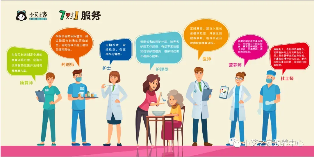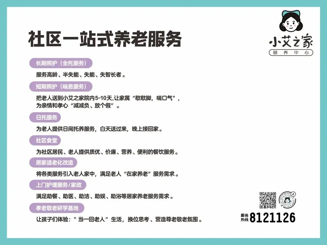 小艾之家养护院(福寿路旗舰店)提供“把老人请进来”住养服务和“把服务送上门”居家服务。让老人不离开自己熟悉的生活环境就能享受到专业的养老服务,实现“原居安老”。