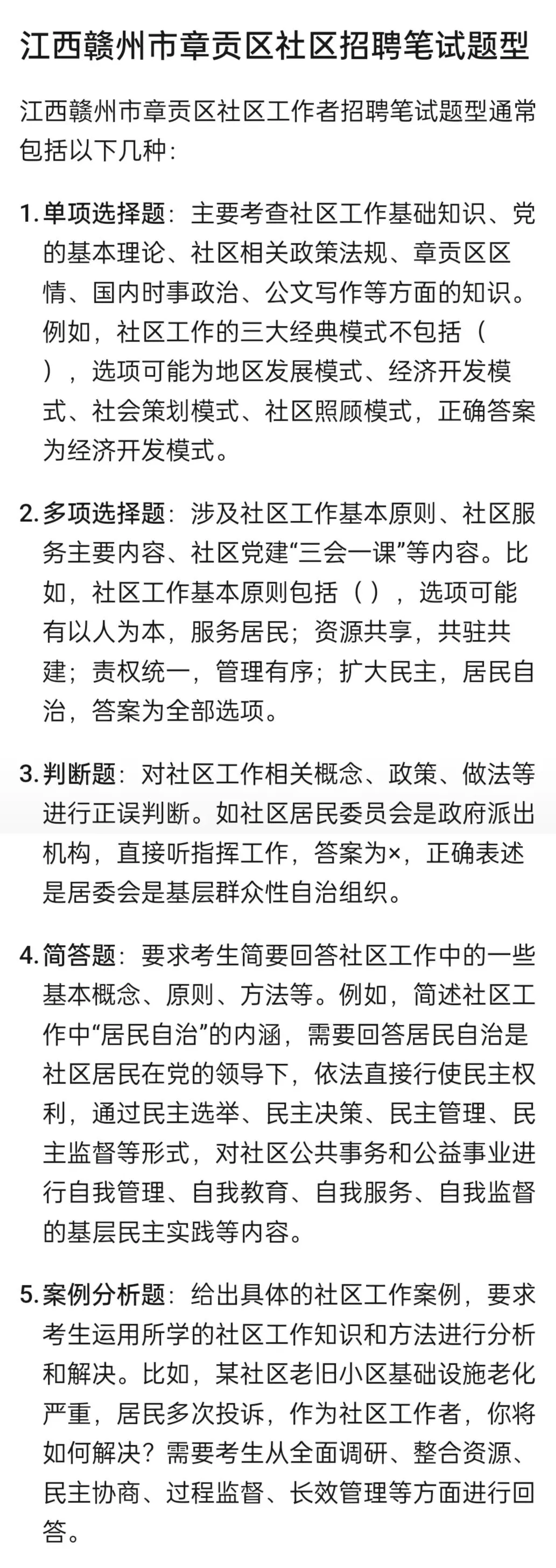主要包括笔试采取闭卷答题方式进行,考试内容为新时代党的基本理论、社区相关政策法规、社区工作基础知识、国内时事政治、章贡区区情、公文写作等。笔试总分为100分