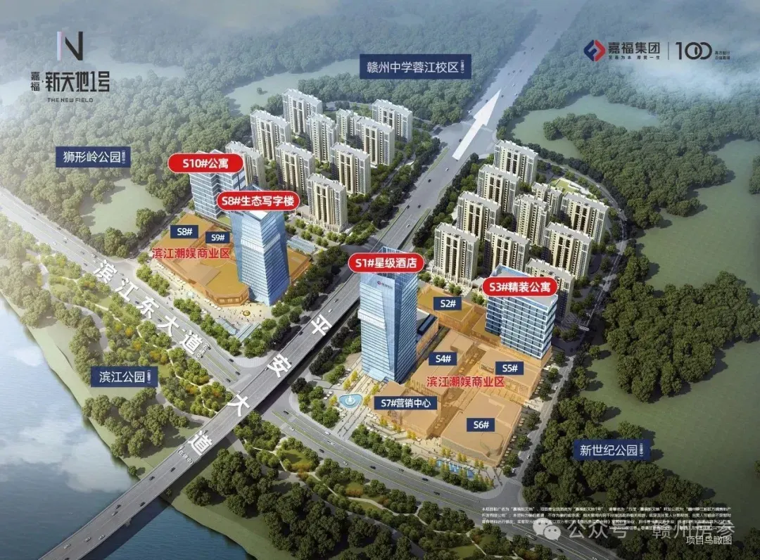 嘉福新天地项目与章江新区隔江相望,被多个主题公园环绕,隔壁是在建的中国稀土集团总部。项目总占地面积 12.55 万平方米,总建筑面积约 45.45 万㎡,业态包含 2 个地块的住宅、主题商业、SOHO 办公、高端酒店、公寓等。其中两栋商业主楼,建筑总高度分别是 135 米和 115 米,是蓉江新区的地标之一。