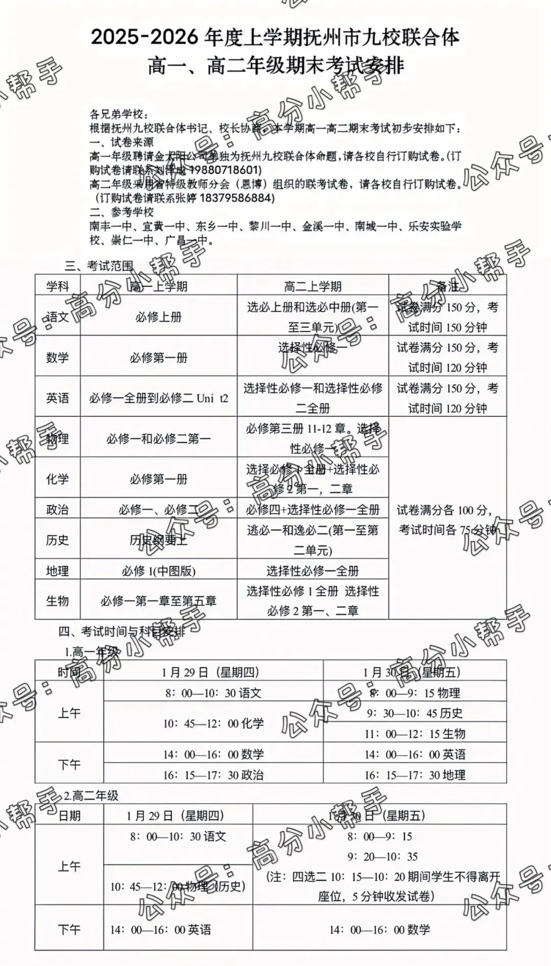根据抚州九校联合体书记、校长协商,本学期高一高二期中考试初步安排如下: