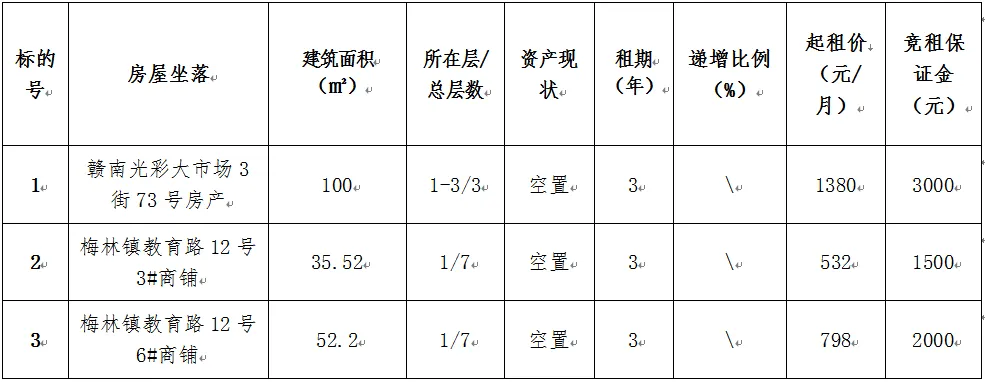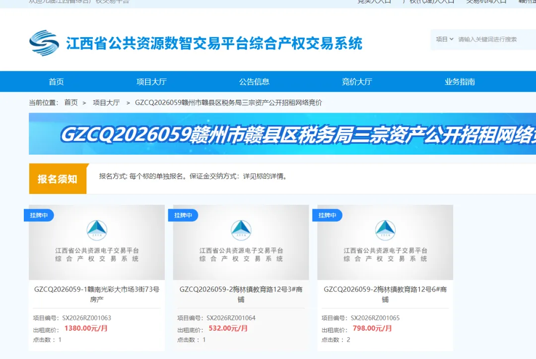 受赣州市赣县区税务局(以下简称“出租单位”)委托,赣州金房拍卖有限公司定于2026年2月6日10:00开始在江西省公共资源数智交易平台综合产权交易系统,通过网络竞价公开招租赣州市赣县区税务局三宗资产,现将有关事项公告如下:
