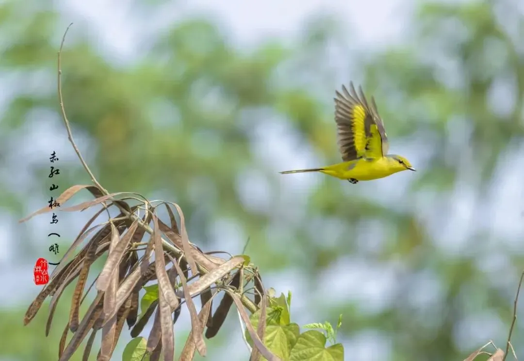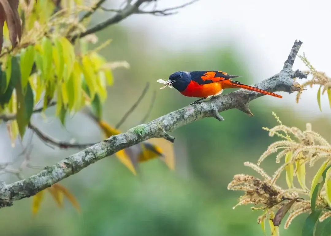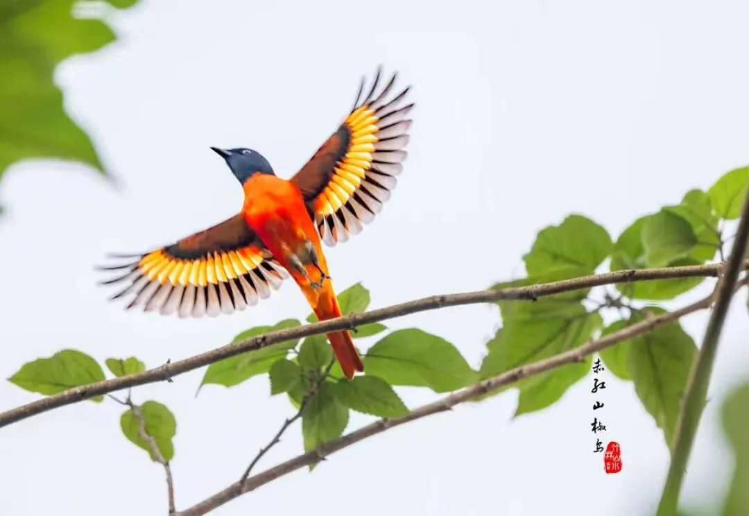 这是因为它们“一红一黄”的经典夫妻装和活泼习性。赤红山椒鸟的雌鸟和雄鸟羽色差异极大,雄鸟身披“赤红与亮黑”的战袍,宛如枝头耀眼的 “红辣椒”;雌鸟则以“金黄与灰褐”为主色调,看起来像一枚 “黄辣椒” 。它们生性活泼,常在树冠层成群或成对活动,尤其是在繁殖期,成双入对的身影让它们赢得了 “丛林小情侣” 的浪漫昵称。