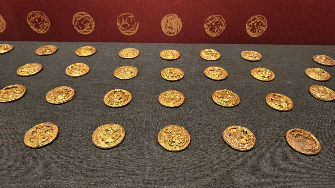 二楼这里有最震撼的视觉冲击——成堆的马蹄金、麟趾金、金饼,总重达115公斤,堪称“西汉氪金大佬”的家底。