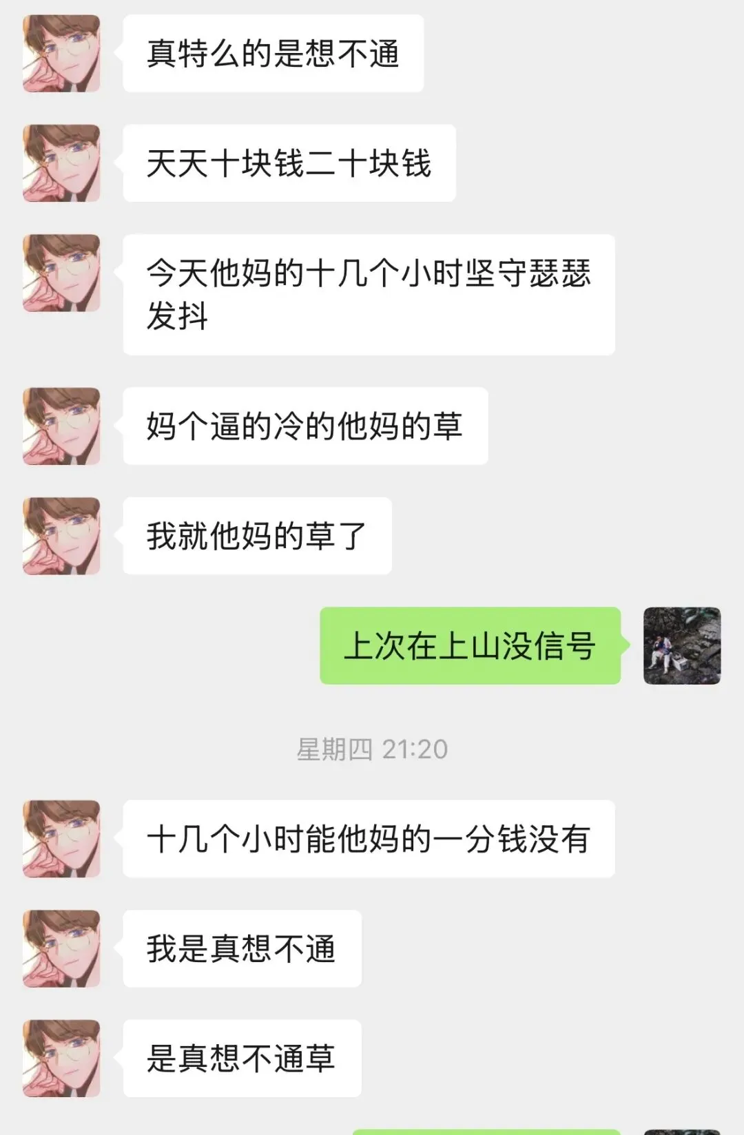 最近的他,陷入了一种近乎癫狂的状态。总觉得自己老子天下第一,觉得路人都是傻逼;也曾向我求助过几次,哪怕之前,他还群发消息骂过我,我还是伸出了援助之手。我懂,人在走投无路、无助到极致的时候,总会做些极端的事,那是他的挣扎,也是他的保护色。