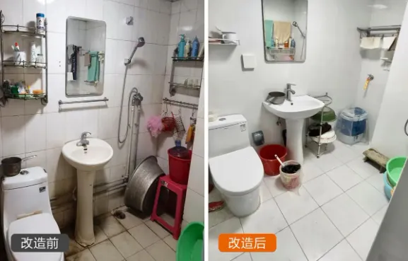 改造后的卫生间明亮整洁,大块瓷砖让整个空间显得更加宽敞。空间内的所有缝隙均做了防霉防潮处理,地面也做了防滑处理,排除了卫生间的健康和安全隐患。整个空间变得干爽、洁净,让王阿姨一家使用更加方便和安全。