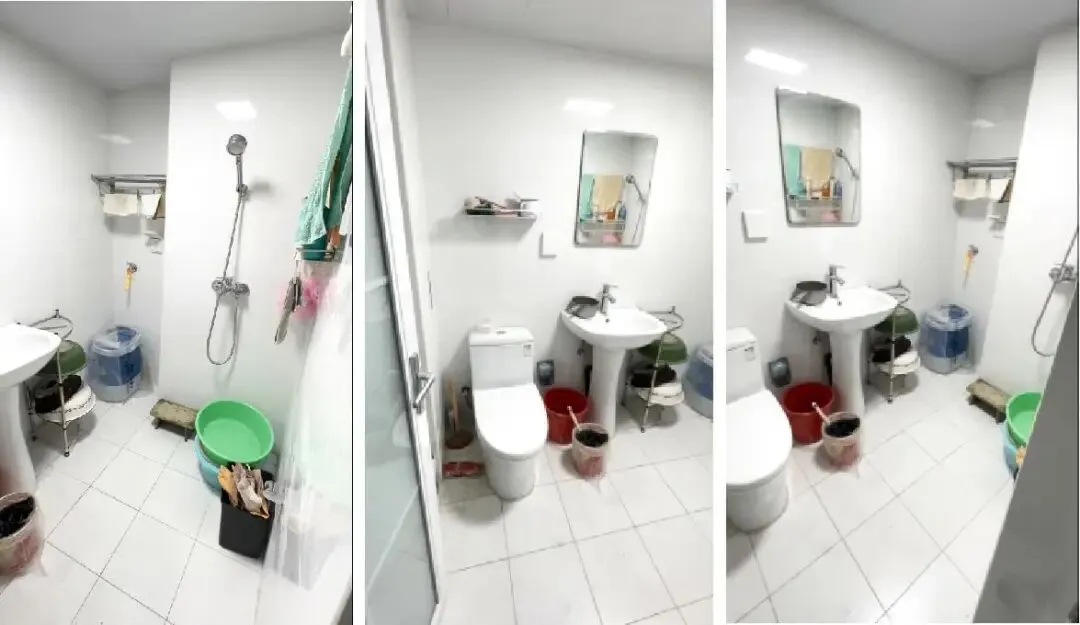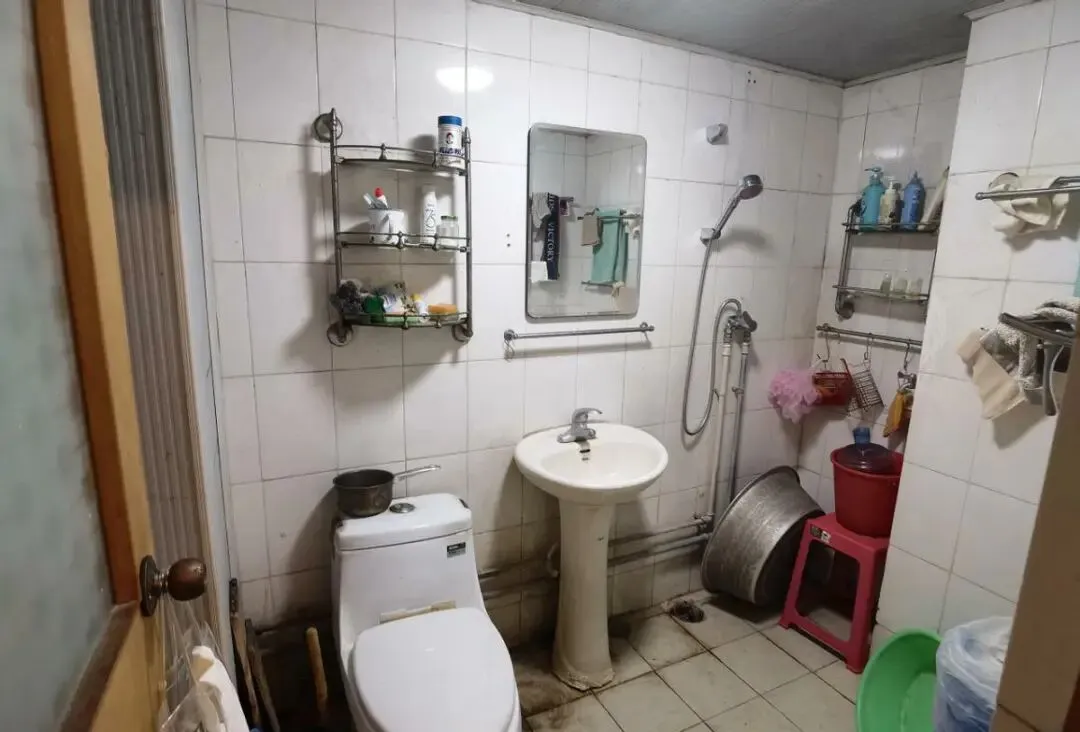 整个卫生间潮气很重,吊顶已经被湿气浸透,有明显的脱落迹象。整个空间藏污纳垢,地面堆积了厚厚的污渍,早已经清理不干净,而且非常湿滑,踩上去特别容易滑到。墙面缝隙布满霉菌,对人的健康,特别是呼吸系统的健康造成影响。