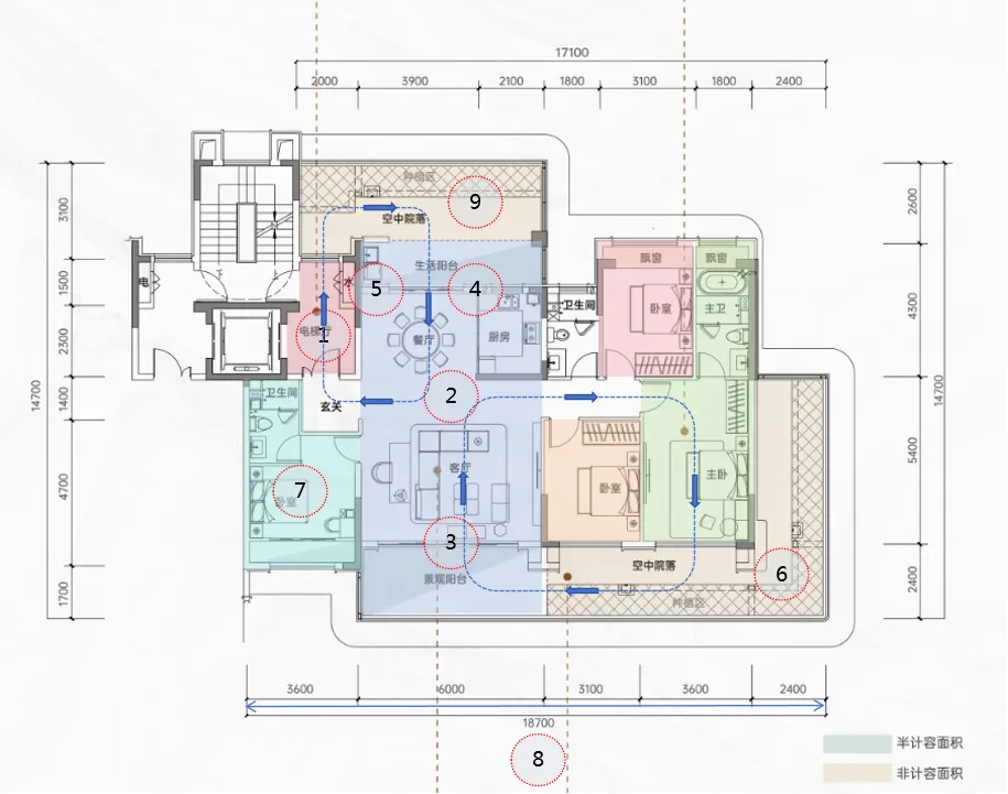 5.餐厅与阳台、空中庭院、电梯厅形成第二条洄游动线;