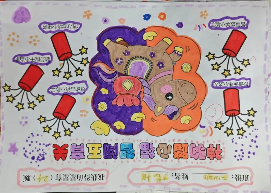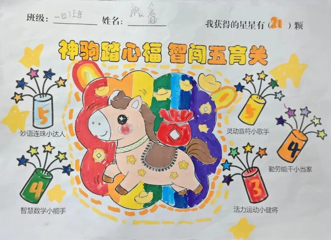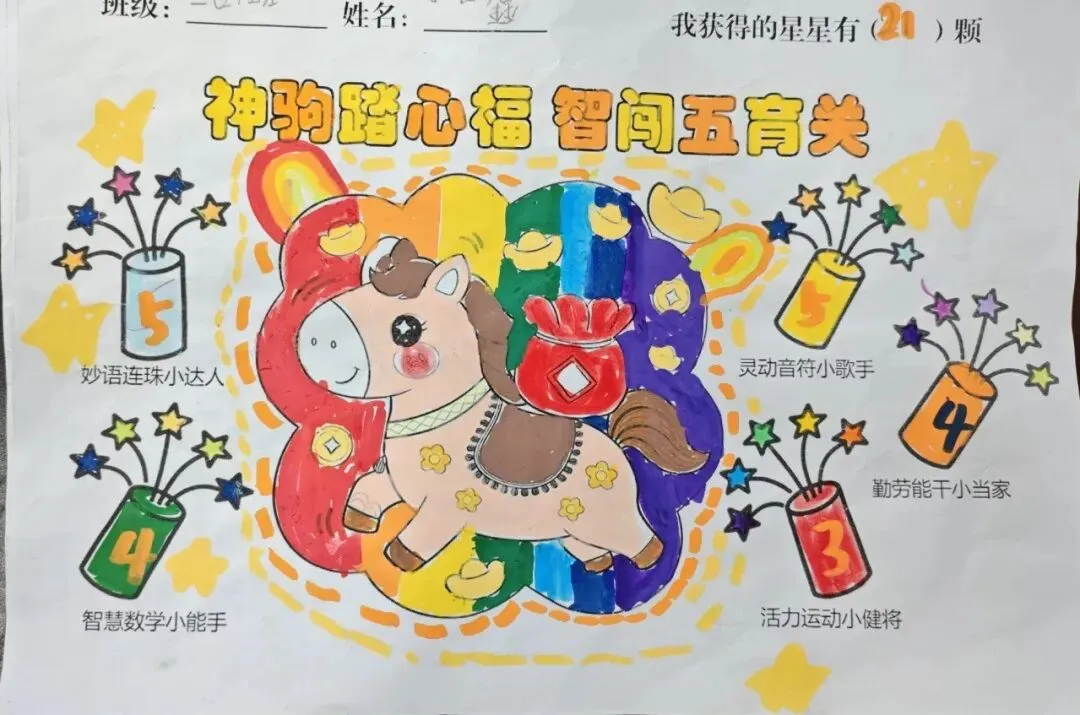游园闯关结束后,孩子们手持满载星星的游园卡,用彩铅、蜡笔精心涂色、绘制边框、添加创意图案。一张张个性十足的卡片,既记录着孩子们的收获,更定格了马年里的成长瞬间,成为校园生活中珍贵的回忆。