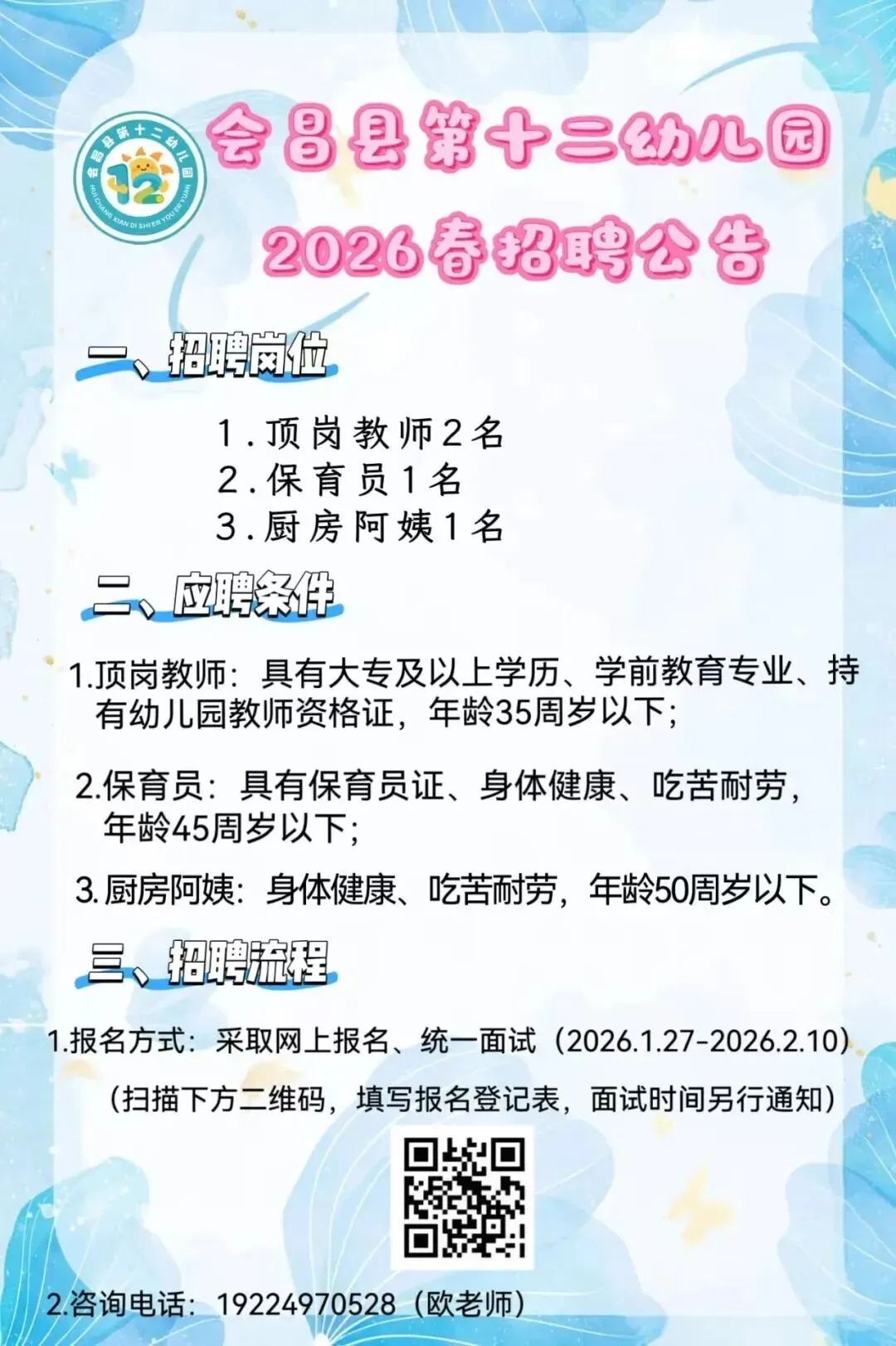 【声明】本公告来源于“会昌县第十二幼儿园官微”,由“幼师招聘网”公众号整理编辑,仅用于学习交流目的,若涉及侵权和错误信息,请扫描上方二维码联系予以更改或删除。