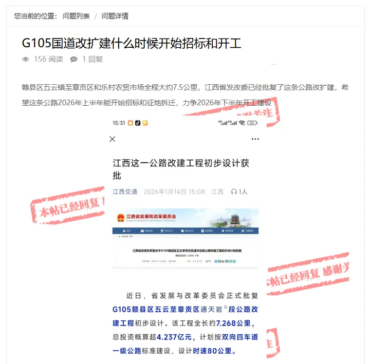 赣县区五云镇至章贡区和乐村农贸市场全程大约7.5公里,江西省发改委已经批复了这条公路改扩建,希望这条公路2026年上半年能开始招标和征地拆迁,力争2026年下半年开工建设