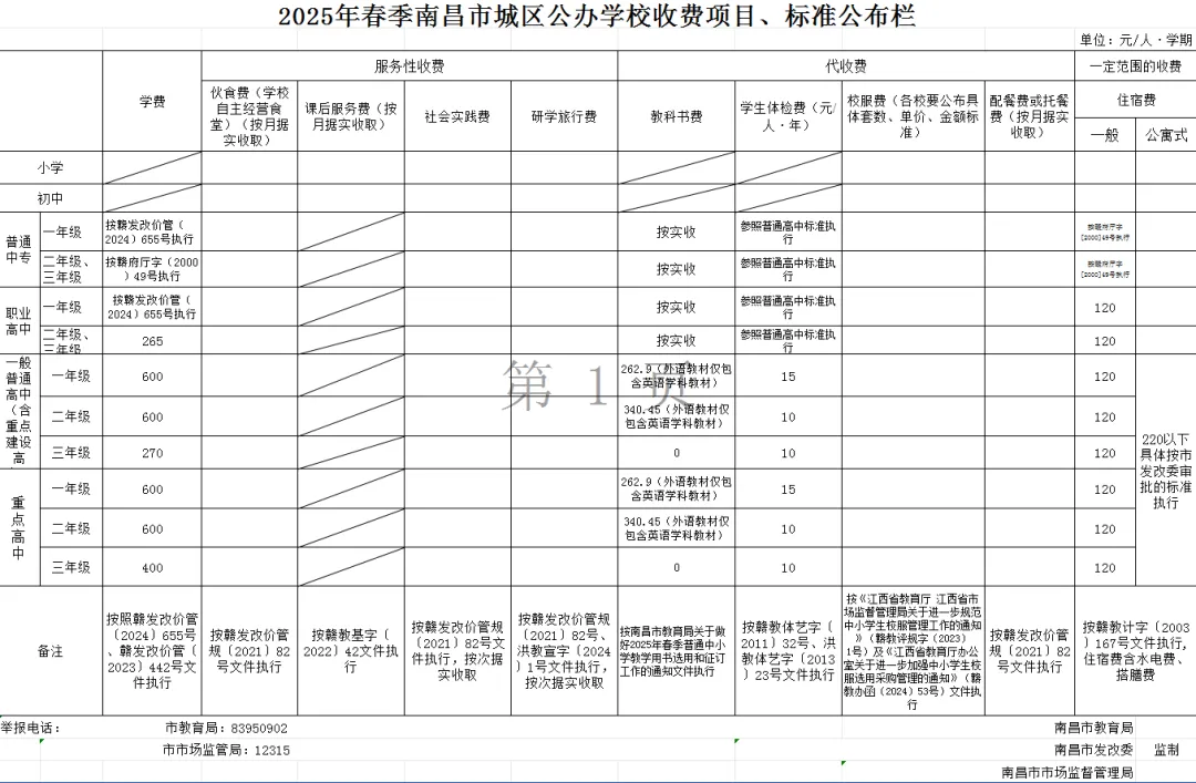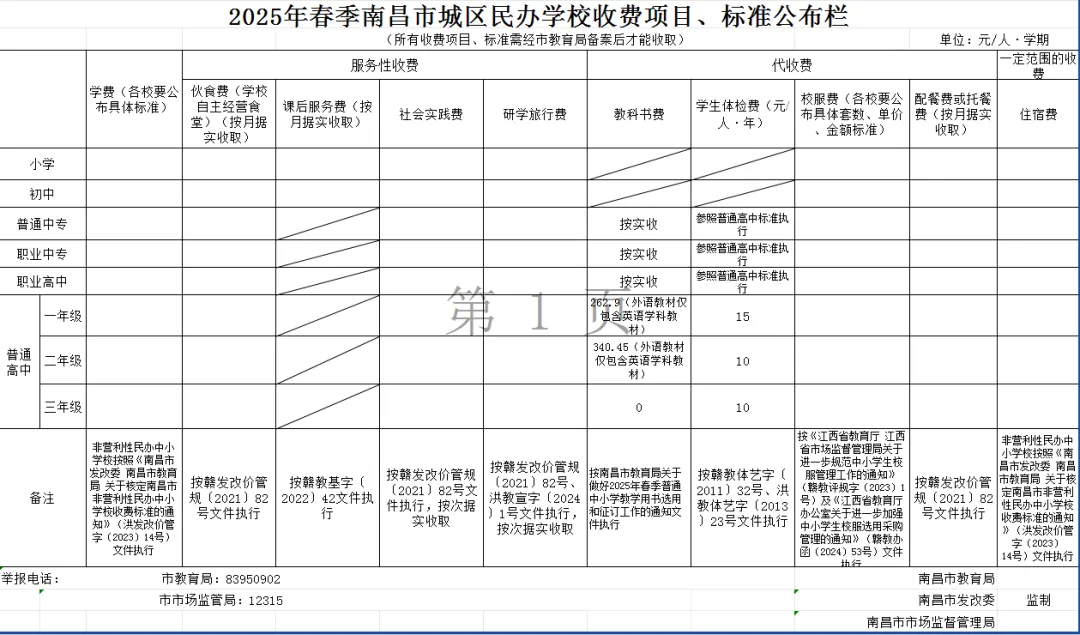 (1)教科书费:教科书的选用和征订严格按照《南昌市教育局关于做好2025年春季普通中小学教学用书选用和征订工作的通知》执行。城乡义务教育学校实行统一的“两免一补”政策,免费向学生发放国家课程和地方课程教科书。高中阶段教科书费含与教科书配套数字音像材料严格按照省发展和改革委员会、省新闻出版局核定的价格据实收取。