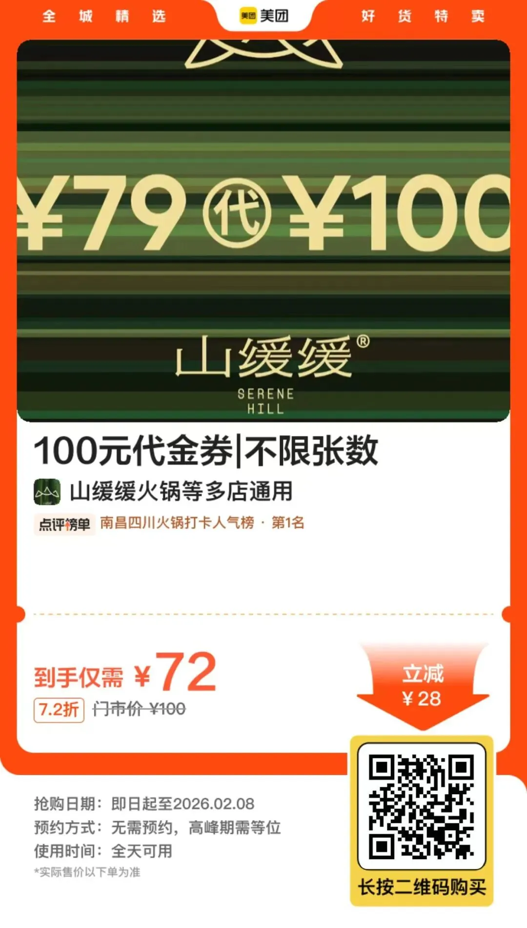 南昌人气王山野火锅「山缓缓」79抵100,无限叠加!多店可用,全场通用!